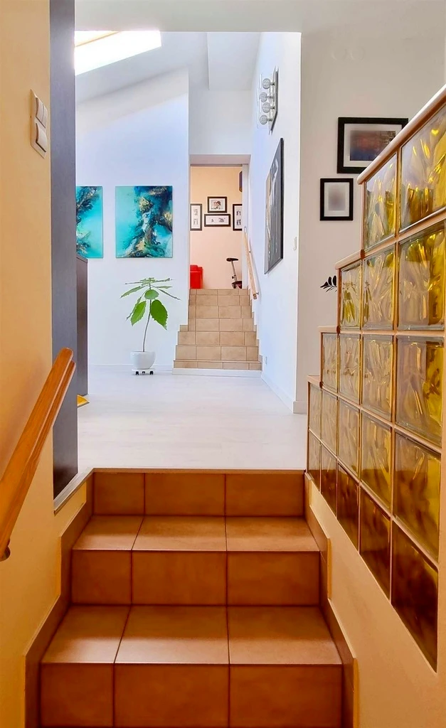 Die geräumige Hauptschlafzimmer bietet Platz für ein großes Bett und verfügt über ein begehbares Ankleidezimmer – ein echtes Highlight für all jene, die Wert auf Stauraum legen. Ein zusätzlicher Raum mit Einbauschrank auf einer erhöhten Ebene eignet sich perfekt als zweites Schlafzimmer oder als Homeoffice.