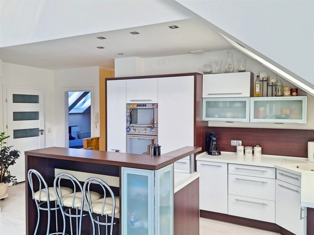Das großzügige und offen gestaltete Wohnzimmer wird durch bodentiefe Fenster mit natürlichem Licht durchflutet und führt direkt auf den nach Süden ausgerichteten Balkon – ideal für entspannte Stunden in der Sonne. Der Wohnbereich ist harmonisch mit der stilvollen, offenen Küche mit Essplatz verbunden. Die weiße maßgefertigte Küchenzeile verfügt über moderne Einbaugeräte: Kühlschrank, Geschirrspüler, Backofen, Mikrowelle und eine Kochinsel mit Induktionskochfeld.