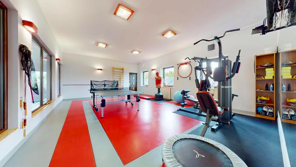 - einem komplett ausgestatteten Fitnessraum mit speziellem Bodenbelag, wie er in professionellen Studios verwendet wird.