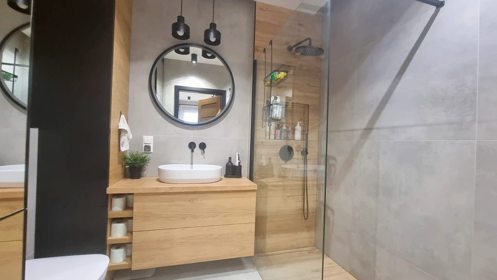 Komfortables Badezimmer: Die stilvolle Walk-in-Dusche sowie der maßgefertigte Einbauschrank mit Platz für Waschmaschine und Trockner sorgen für hohen Nutzungskomfort.