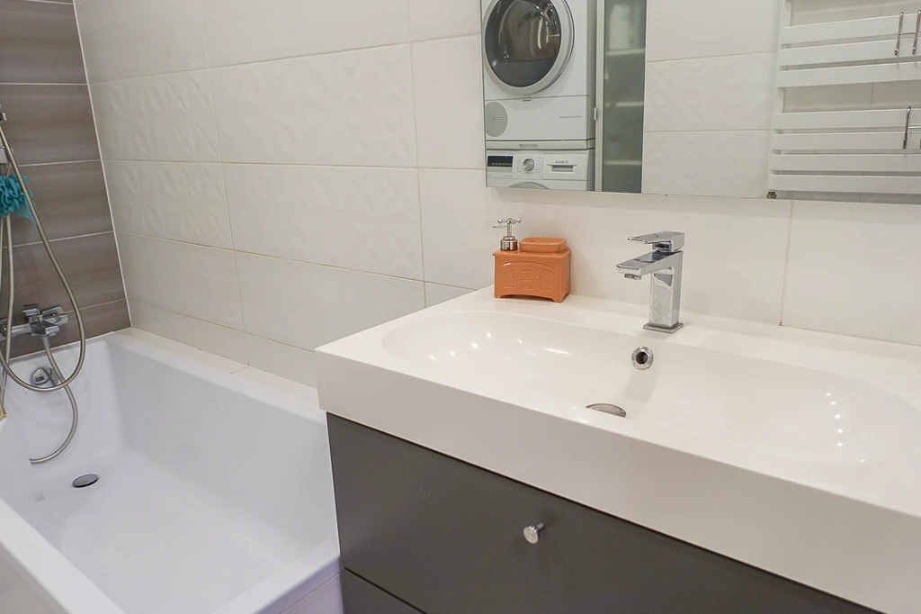 Badezimmer – ca. 6 m²: Ausgestattet mit Badewanne, Waschbecken, Waschmaschine und Trockner (beides inklusive), Handtuchheizkörper.