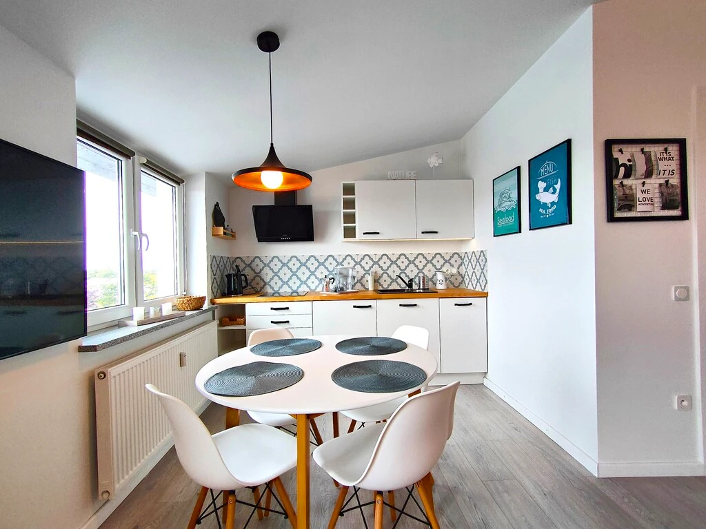 Die moderne Küchenzeile ist voll ausgestattet und fügt sich harmonisch in den Wohnbereich ein. Helle Farben und hochwertige Materialien schaffen ein entspanntes Wohnambiente.