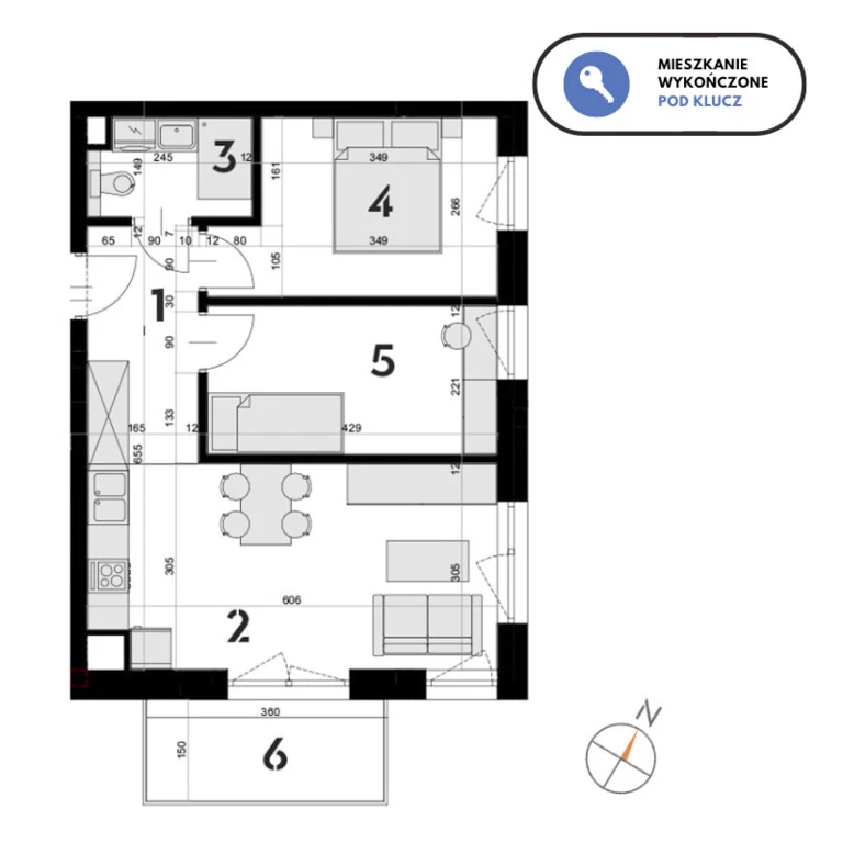 Die Wohnung wurde bezugsfertig („pod klucz“) ausgebaut und bietet hochwertigen Wohnkomfort auf einer Gesamtfläche von 46,09 m². Die Fenster sind zur Südostseite ausgerichtet und sorgen für viel Tageslicht.