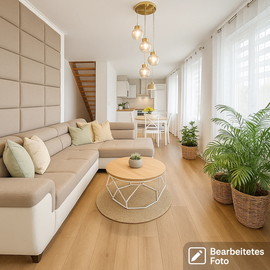 Die Wohnung erstreckt sich über zwei Ebenen und bietet dank ihrer durchdachten Raumaufteilung ein komfortables und funktionales Wohngefühl. Im unteren Bereich befindet sich ein heller Wohnbereich mit direktem Zugang zum sonnigen Balkon – perfekter Ort zum Entspannen. Die Küche ist offen gestaltet und verfügt über eine praktische Durchreiche.