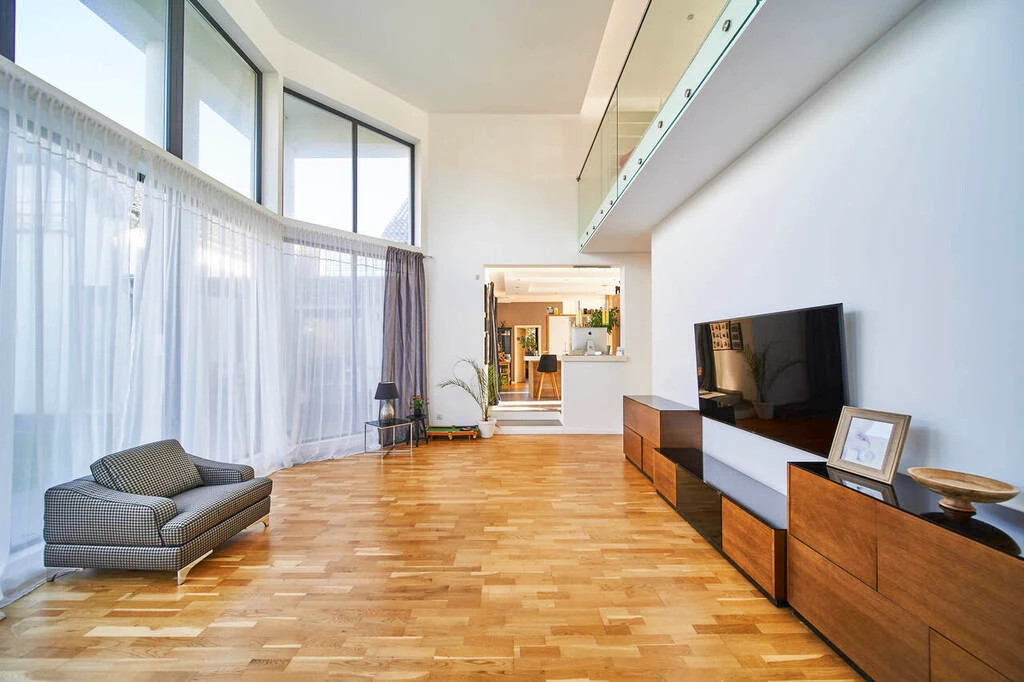 - Hochwertige Materialien: Naturholzböden (Eiche), Parkett, Fliesen, Holzfenster, keramische Dachziegel