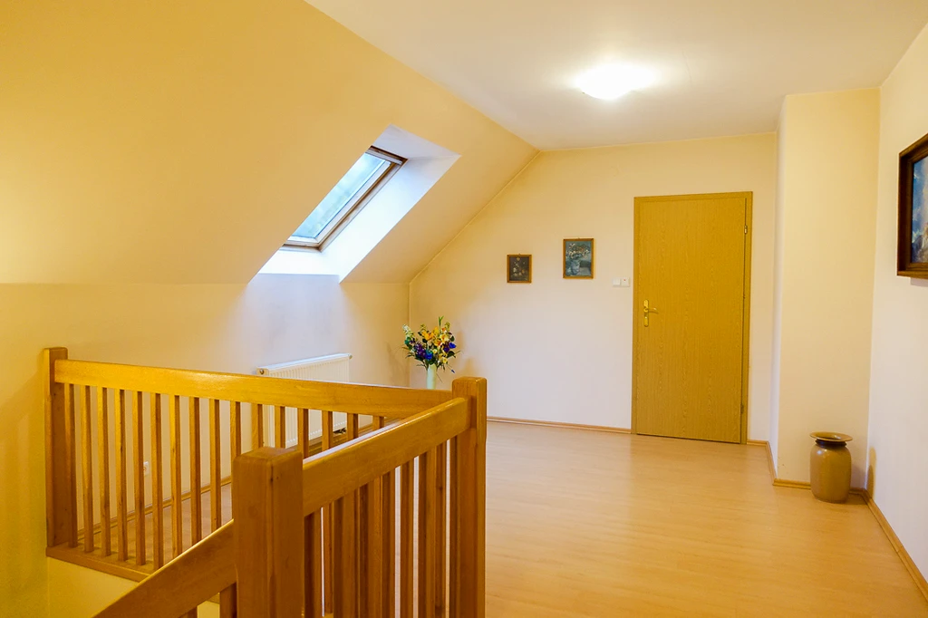- Offener Loungebereich im Flur (18,5 m² / Bodenfläche: 20 m²): Mit Dachflächenfenster.