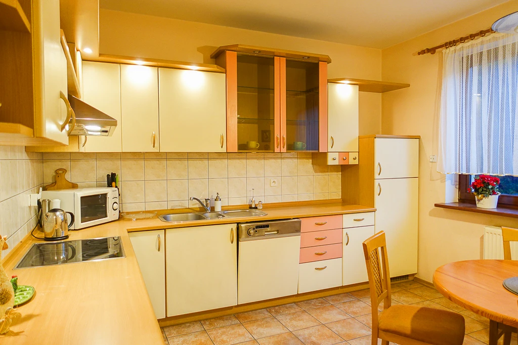 - Separate Küche (13,5 m²): Quadratisch geschnitten, mit Fenster; ausgestattet mit Einbauküche, Kühlschrank, 60 cm Geschirrspüler von WHIRLPOOL, Elektroherd mit Cerankochfeld und Backofen von AMICA sowie Dunstabzugshaube; mit Esstisch und Stühlen.