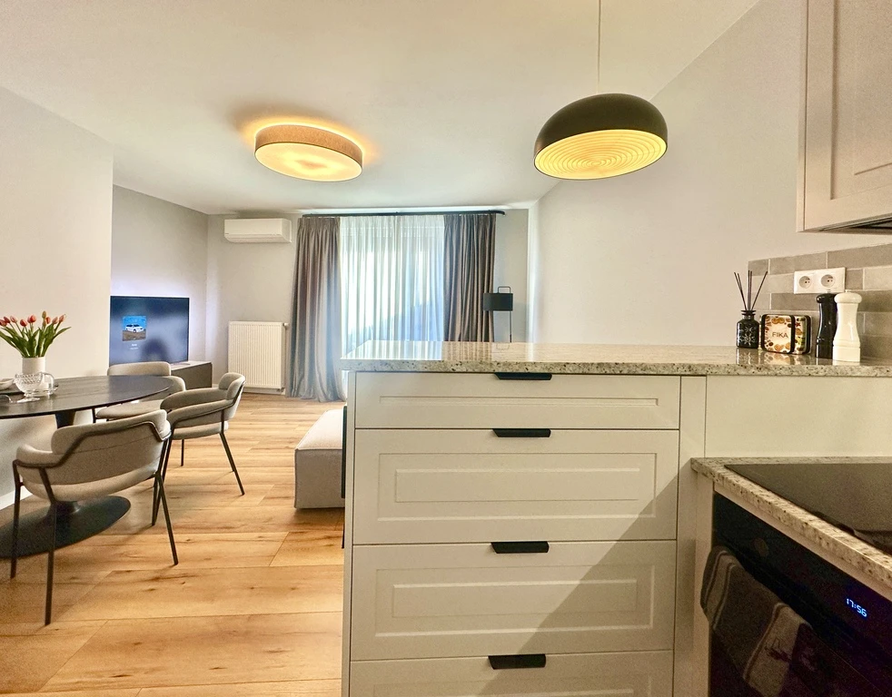 - Küche: Offene Küche mit moderner Ausstattung – Kühlschrank, Backofen und Geschirrspüler sind vorhanden