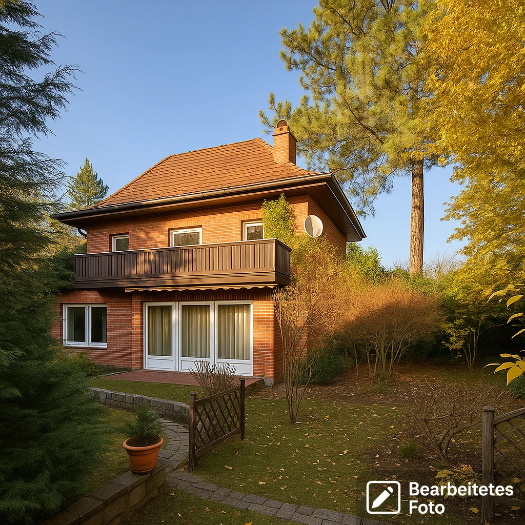 Das ca. 946 m² große Grundstück überzeugt mit altem Baumbestand, einer gemauerten Gartenlaube und sogar einem gemauerten Pool – eine wahre Oase der Ruhe. Die idyllische Lage an einer ruhigen, nicht durchfahrbaren Straße bietet maximale Privatsphäre und Erholung im Grünen.