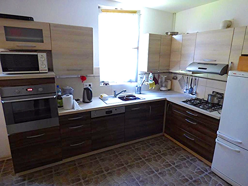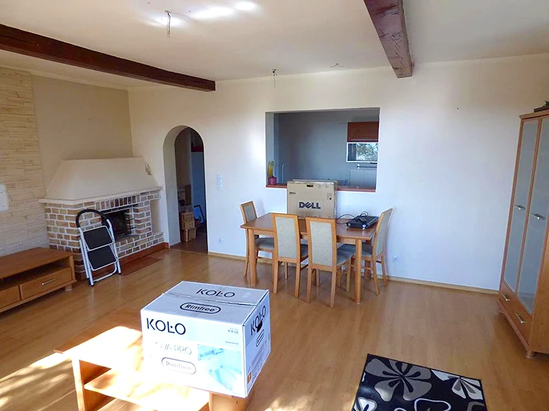 - Wohnung im Obergeschoss: 4 Zimmer, helle Küche, Badezimmer, separates WC, Flur, zwei Terrassen.