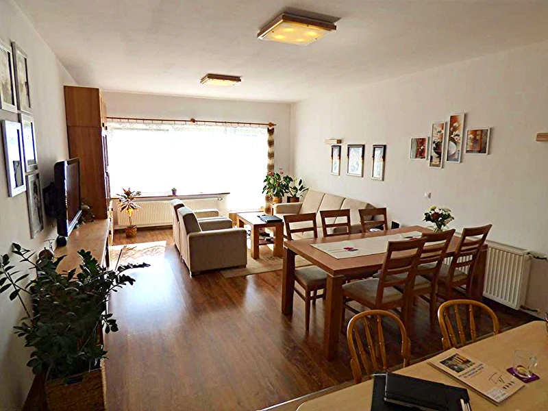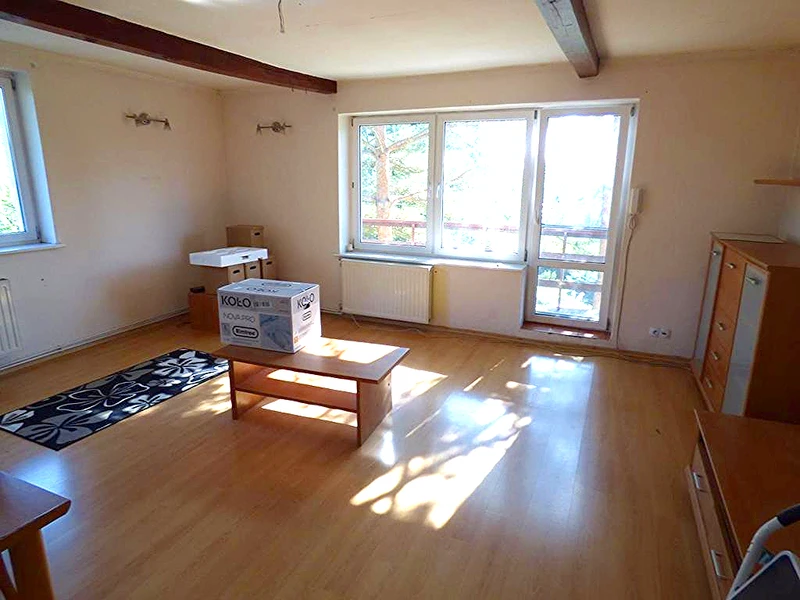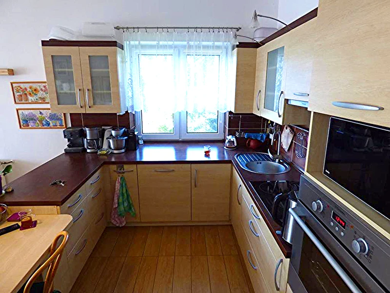 - Weitere Wohnung im Obergeschoss: 4 Zimmer, helle Küche, Badezimmer, zwei Balkone, Flur.