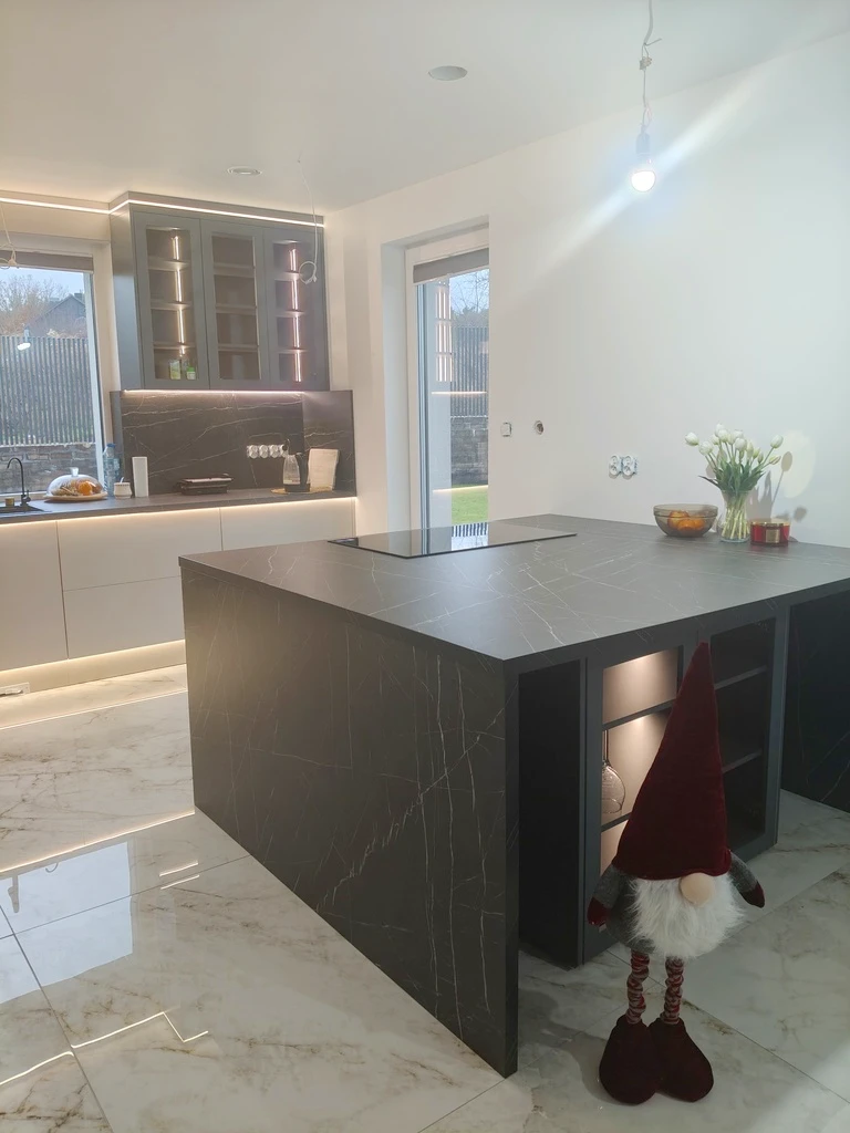 Erdgeschoss - Großzügiger, heller Wohnbereich mit modernem Kamin (mit Wasserwärmetauscher) - Offene Küche mit maßgefertigter Einbauküche und hochwertiger Ausstattung, angrenzender Speisekammer - Praktischer Flur mit Zugang zur Garage, Gäste-WC und Hauswirtschaftsraum