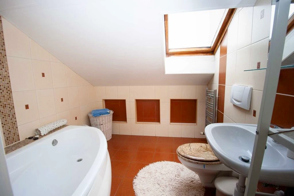 - Großes Schlafzimmer (23 m²) mit Balkon und eigenem Bad (15 m²)
