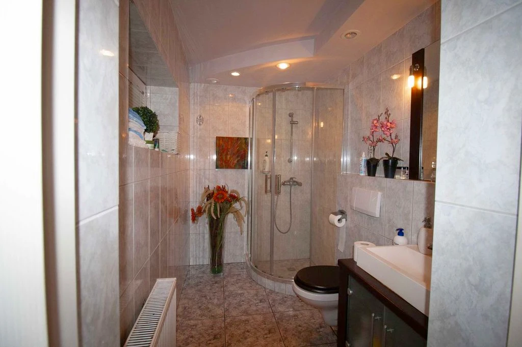 - Badezimmer mit Dusche, Badewanne, Fenster und Heizkörper