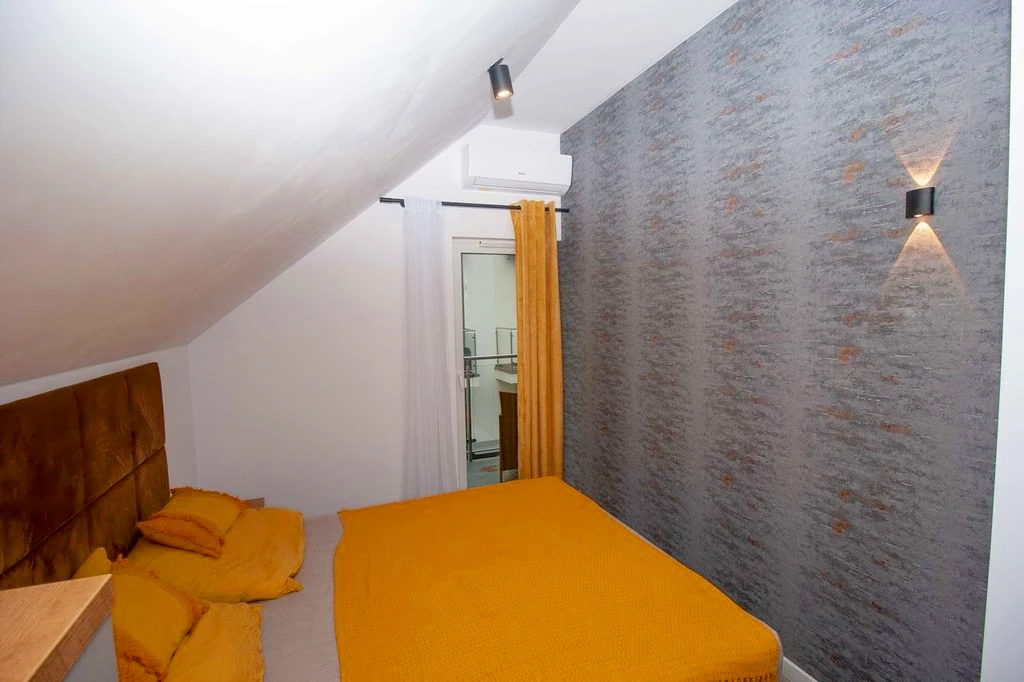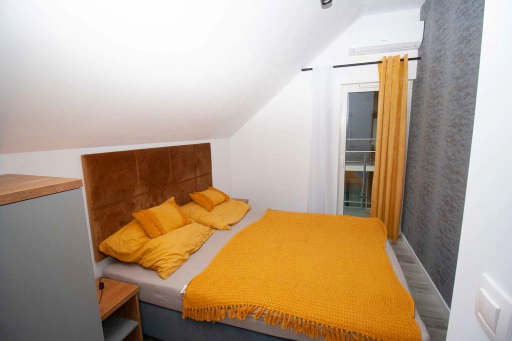 Obergeschoss: Über eine Holztreppe erreicht man das Obergeschoss mit: - Zwei separaten Schlafzimmern – beide mit Zugang zum Balkon - Beide Zimmer sind möbliert mit Betten und Kleiderschrank - Dachboden (nicht ausgebaut) mit ca. 15 m² Nutzfläche, ausgelegt mit OSB-Platten