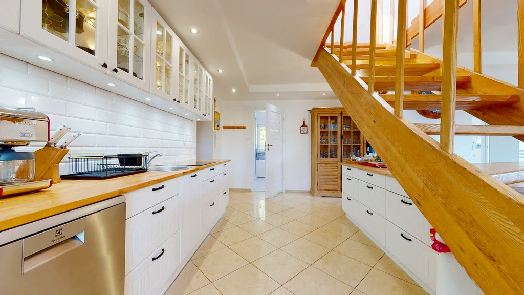 Ein eleganter Treppenaufgang aus Holz führt in das Obergeschoss.