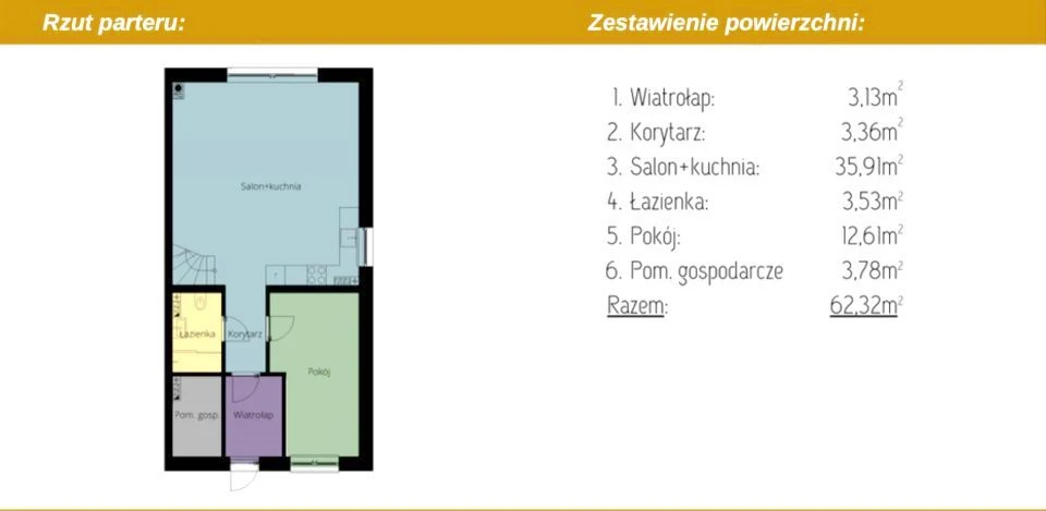 Erdgeschoss: - Großzügiger Wohnbereich mit offener Küche (36 m²) und Zugang zur Terrasse und zum Garten – je nach Variante nach Süden oder Westen ausgerichtet - Büro oder Gästezimmer (13 m²) - Badezimmer mit Dusche (4 m²) - Hauswirtschaftsraum (4 m²) - Eingangsbereich / Flur (6,5 m²)