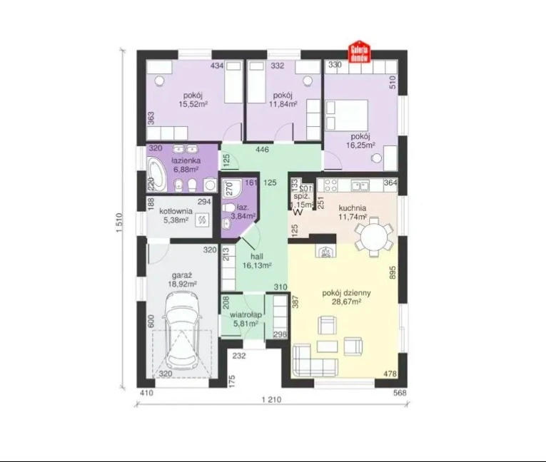- Zusätzliche Fläche: integrierte Garage mit 18,92 m²,