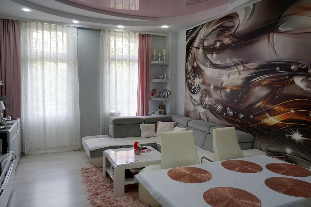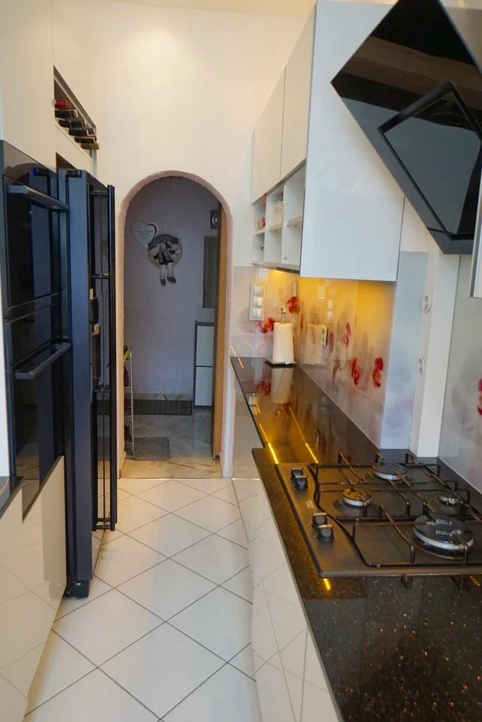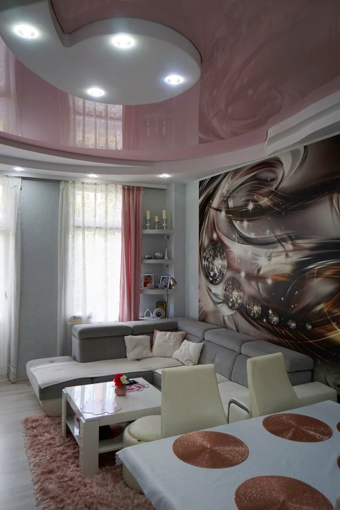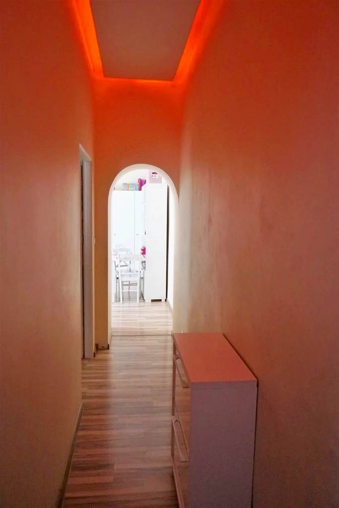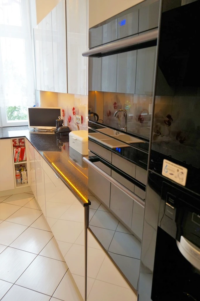 Die Böden in allen Wohnräumen sind mit hochwertigen Paneelen ausgelegt, die Wände glatt verputzt, Decken mit futuristischer LED-Beleuchtung auf mehreren Ebenen unterteilt – ein echtes Design-Highlight. Die Wohnung wurde mit besonderer Sorgfalt eingerichtet und edel ausgestattet.