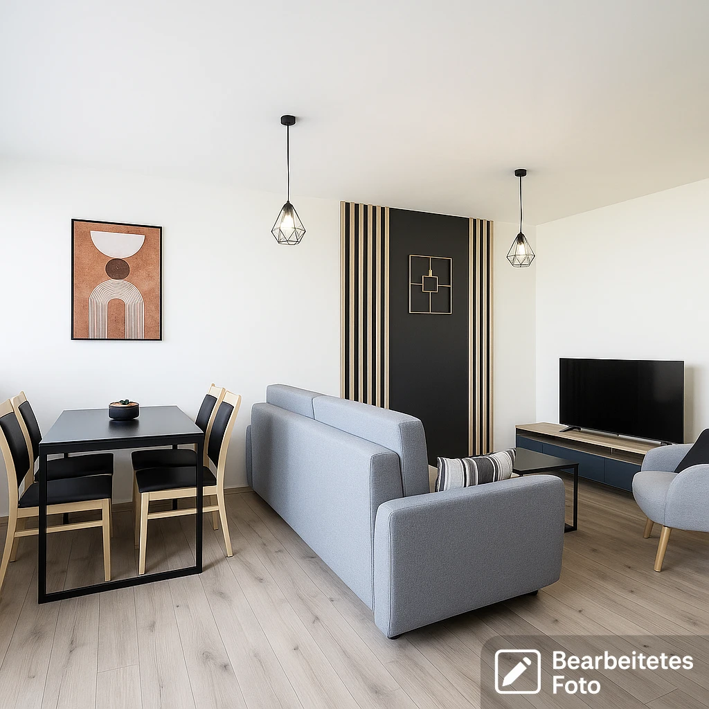 Helles, großzügig geschnittenes Wohnzimmer mit gemütlicher Sitzecke, Esstisch mit Stühlen, Kommode und Fernseher. Die Wände sind glatt geprüft und frisch gestrichen. Eine praktische Arbeitsecke mit Schreibtisch und Bürostuhl ist ebenfalls integriert – ideal für Homeoffice. -