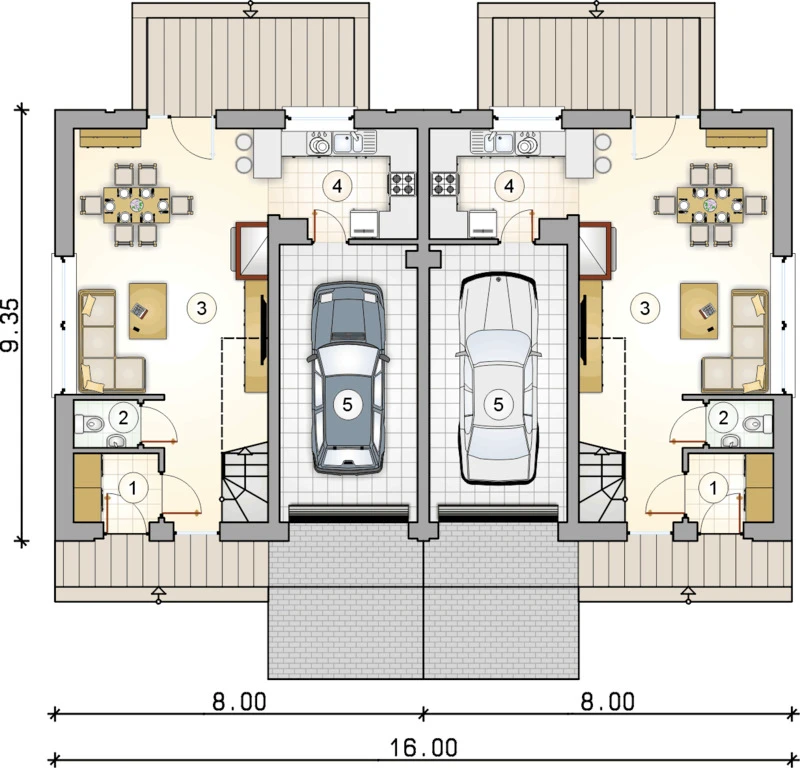Zugang zur Siedlung über zwei elektrische Tore – gesteuerte Einfahrt per Fernbedienung. Acht Wohneinheiten mit identischer Größe von 110,30 m².