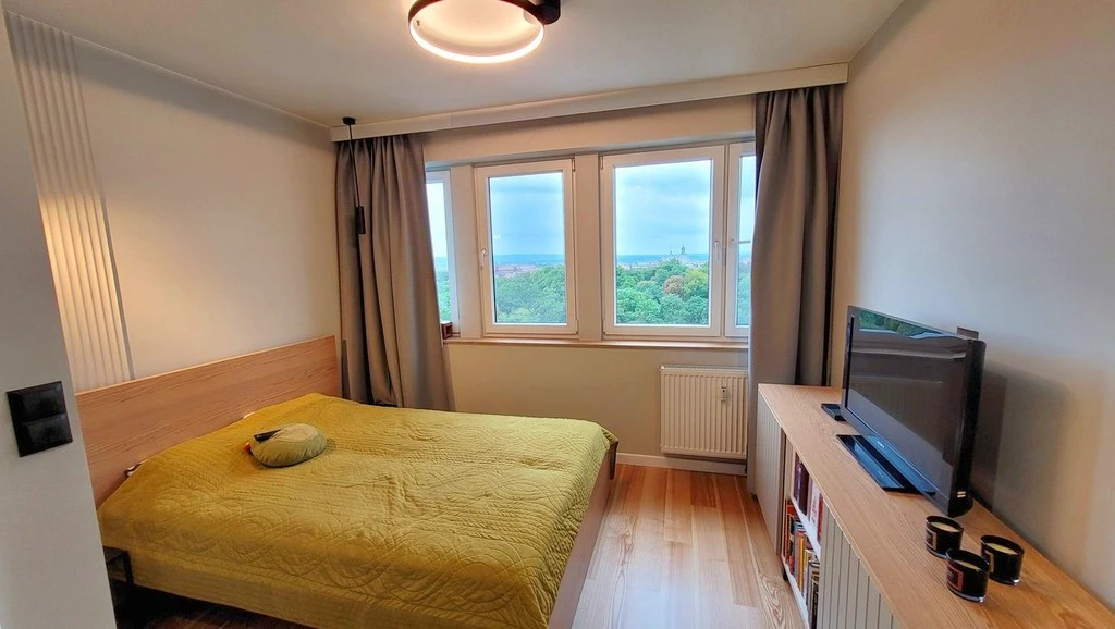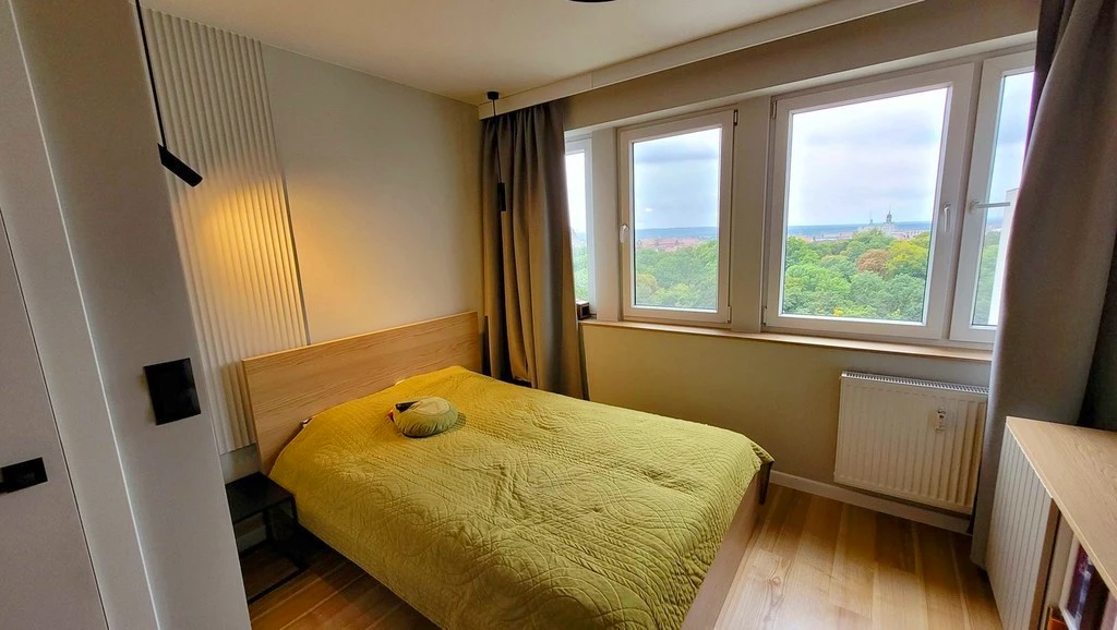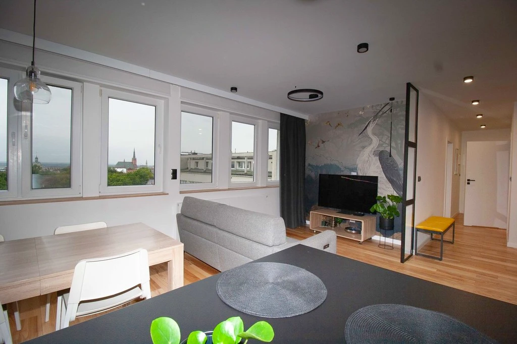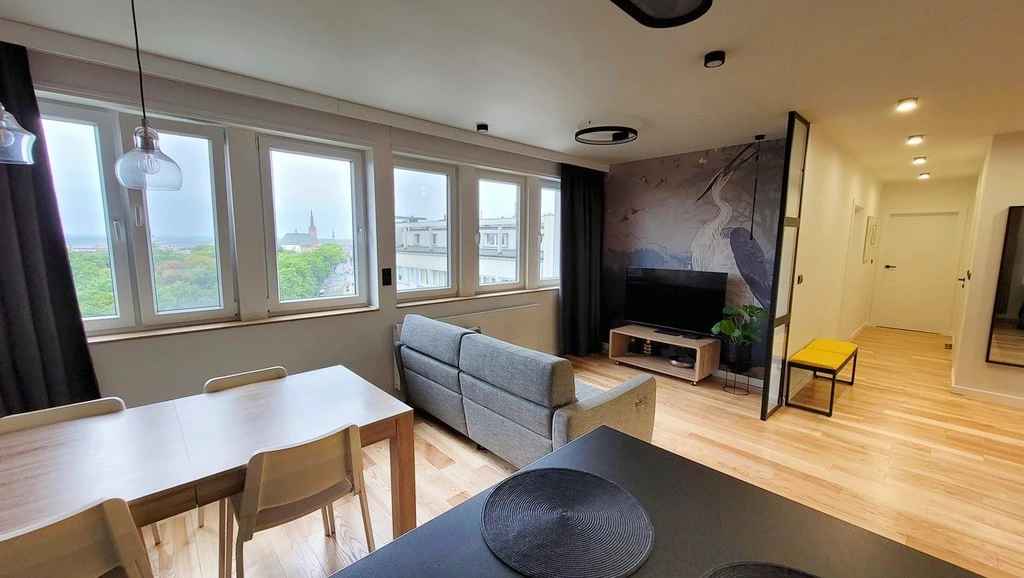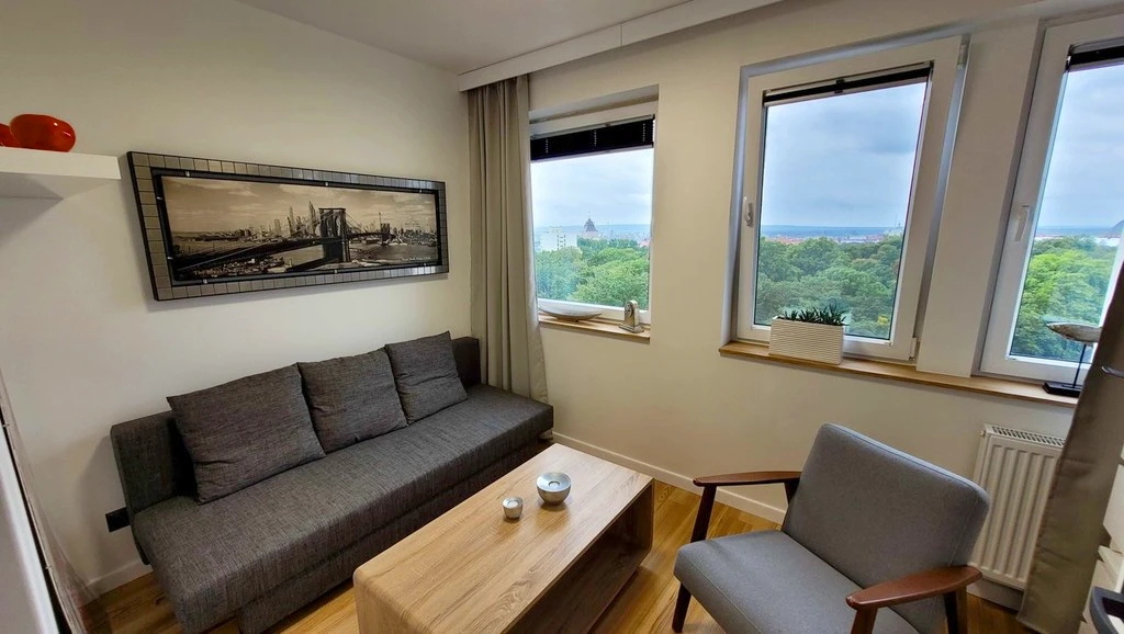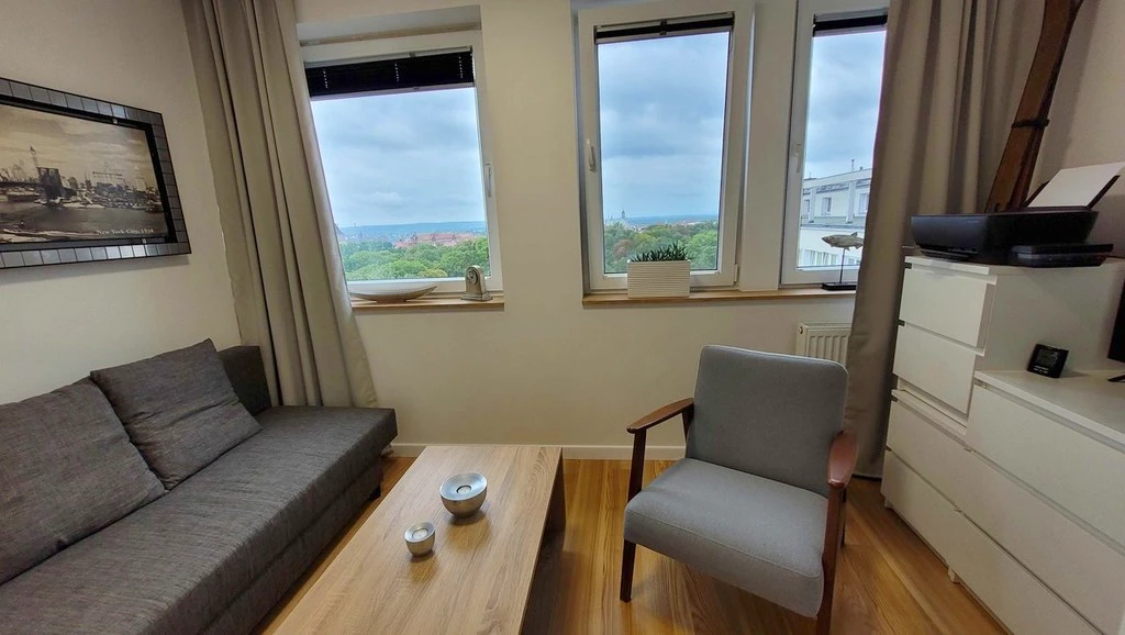 - Atemberaubende Aussicht: Große, südlich ausgerichtete Fenster durchfluten die Räume mit Tageslicht und eröffnen einen eindrucksvollen Blick auf die Stadt, darunter die Chrobry-Wälle, die Philharmonie und das Schloss der Pommerschen Herzöge.