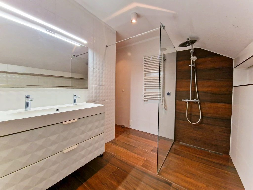 - Bad mit Fenster, Badewanne, Waschbecken, WC, Handtuchheizkörper, Dusche