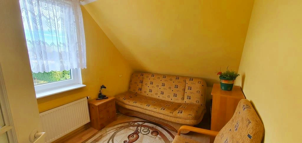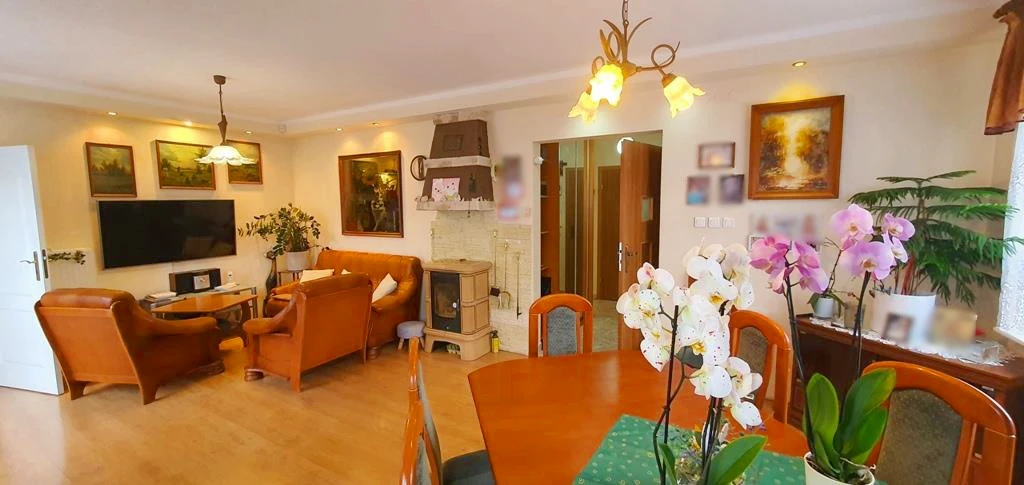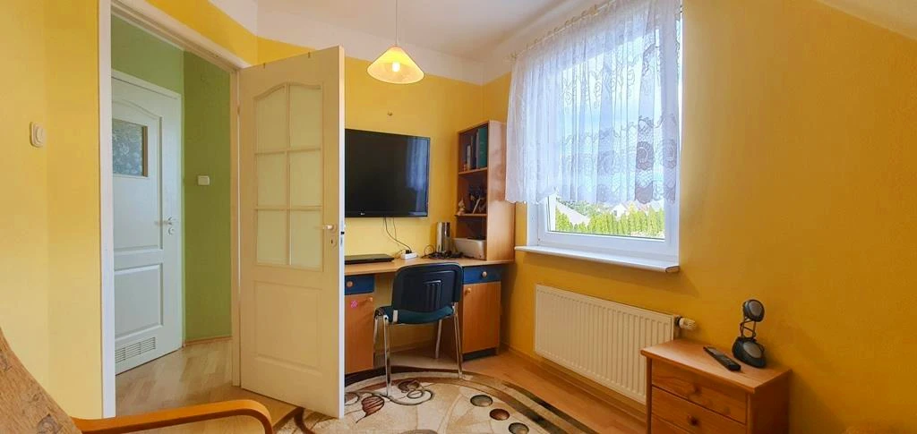 Erdgeschoss: - Heller, geräumiger Wohnbereich mit Essplatz, Zugang zum Garten sowie zur überdachten Terrasse im Stil eines Wintergartens – perfekt für gemütliche Stunden zu jeder Jahreszeit. - Separate Küche mit Fenster (10,6 m²), ausgestattet mit Elektroherd, Spüle, Einbaumöbeln, Kühlschrank mit Gefrierfach, Geschirrspüler und zusätzlicher Speisekammer. - Schlafzimmer mit Zugang vom Wohnzimmer. - Badezimmer mit Dusche, WC und Waschbecken. - Eingangsbereich mit praktischem Einbauschrank.