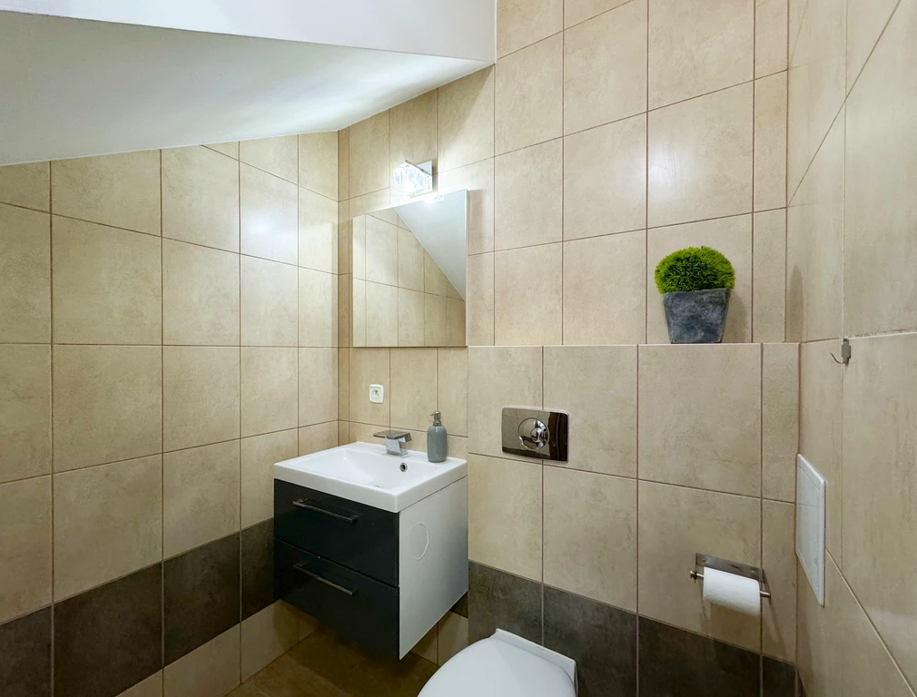 Ein Highlight ist die vorhandene Garderobe, die für zusätzliche Stauraummöglichkeiten sorgt. Ein separates WC ergänzt das moderne Badezimmer, was besonders bei Familien oder Gästen für Komfort sorgt.