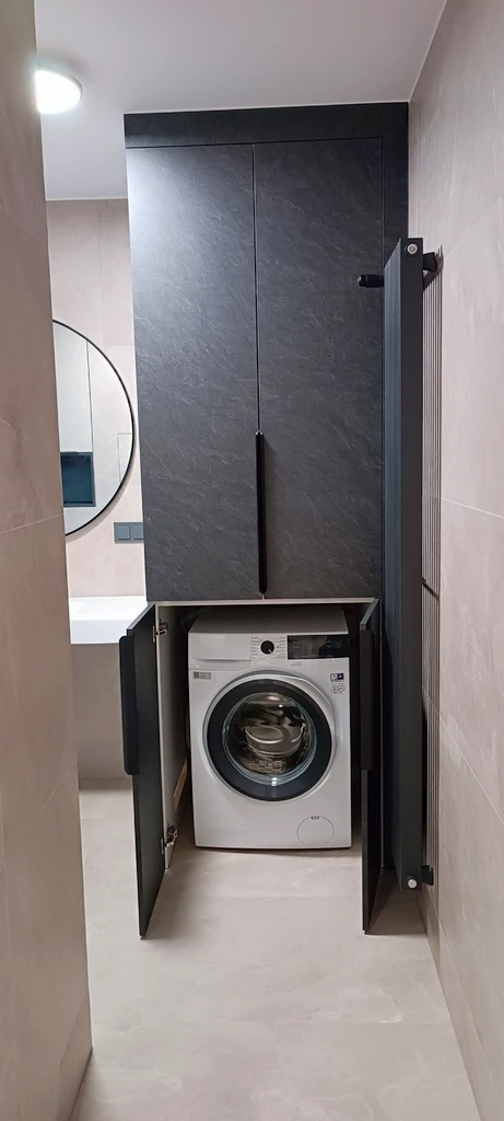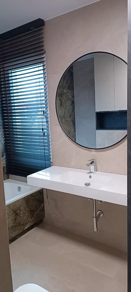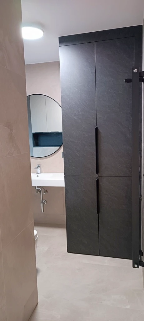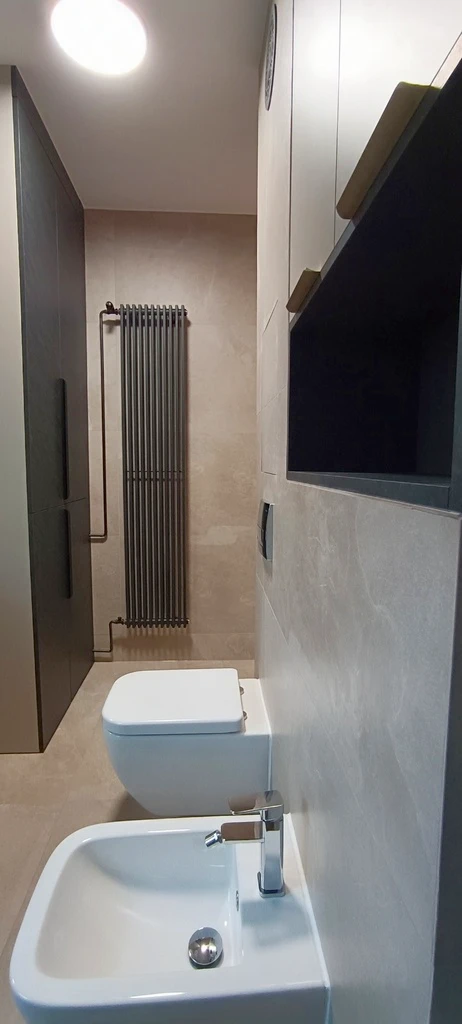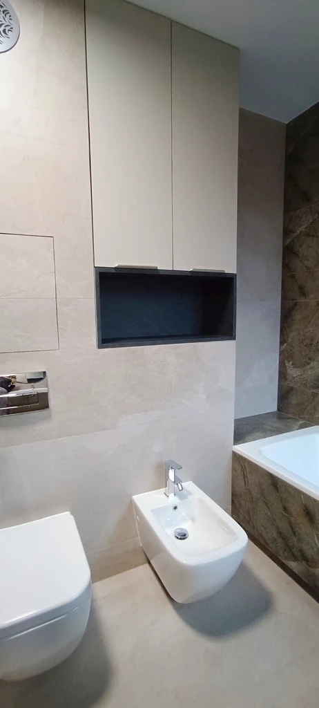 - Wand vollständig bis zur Decke mit dem im Wohnraum verwendeten Feinsteinzeug gefliest