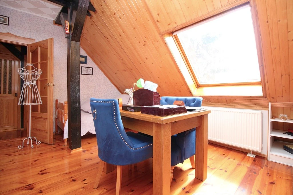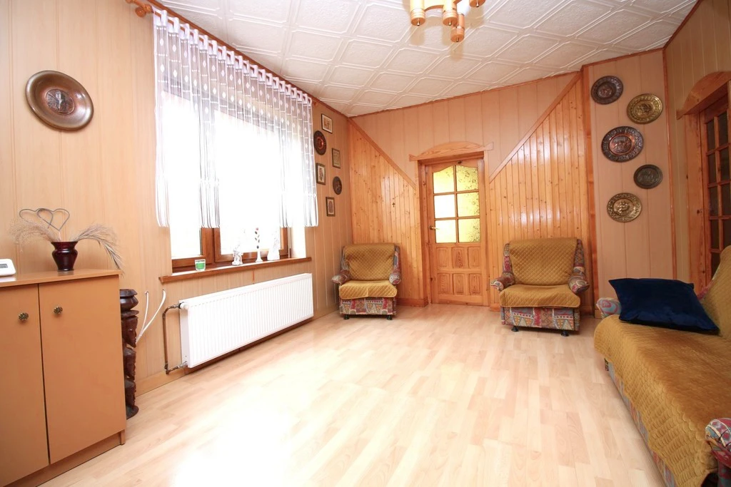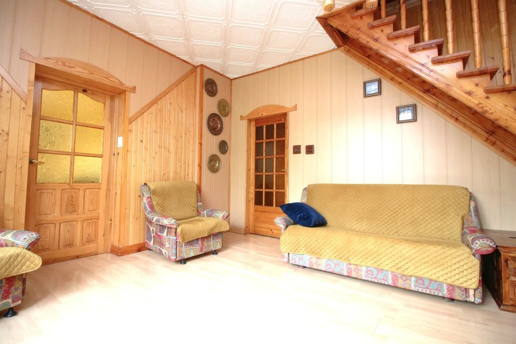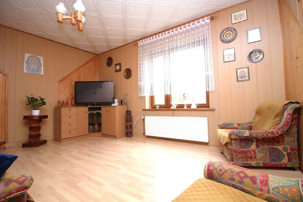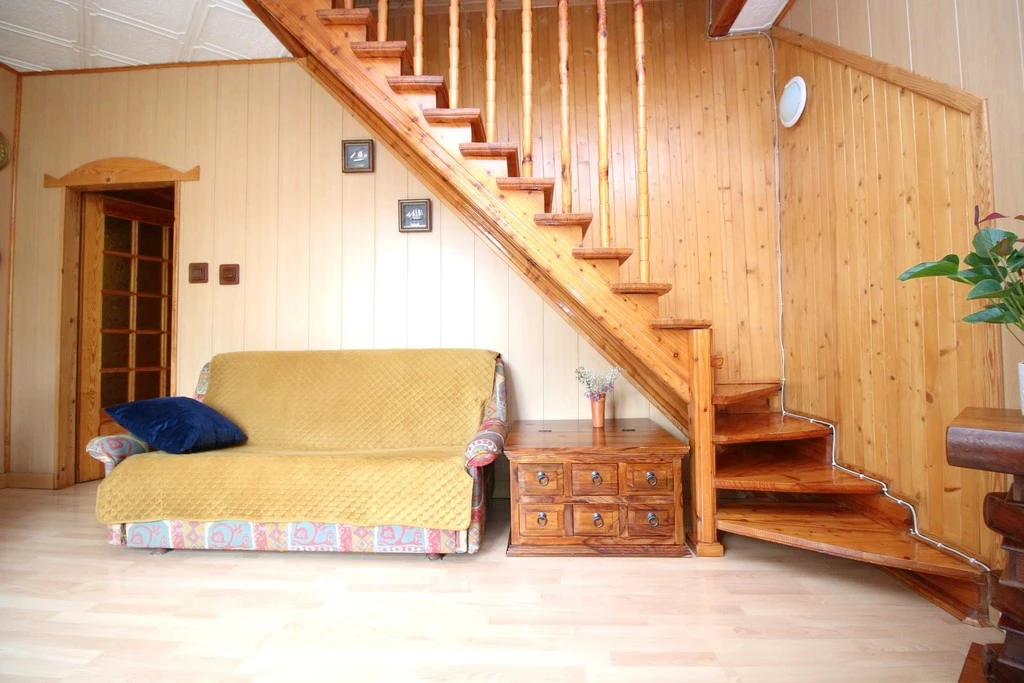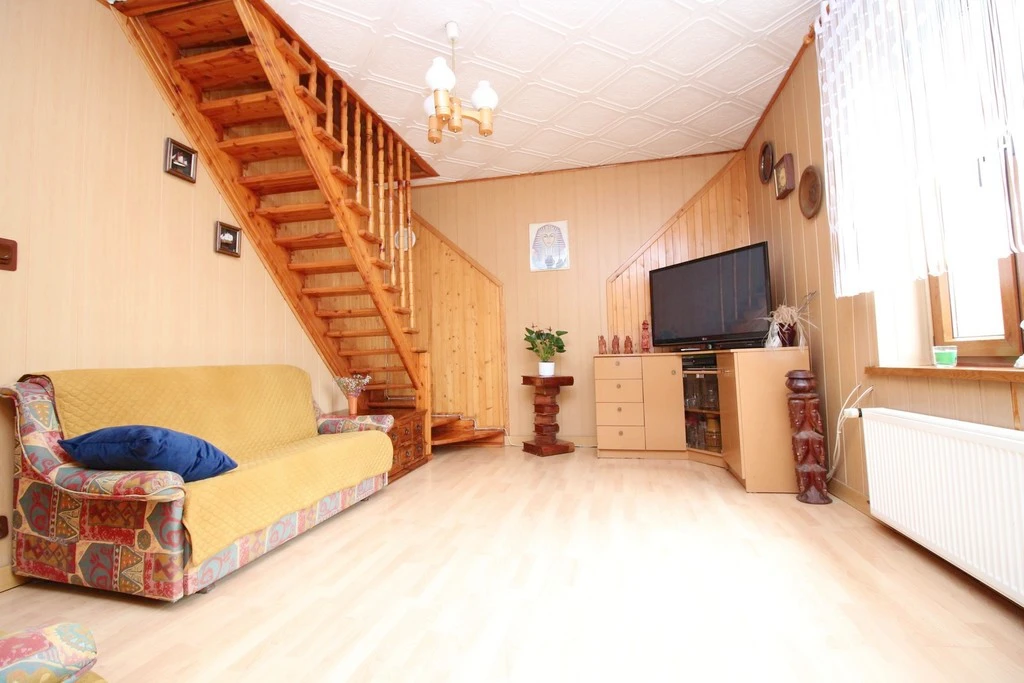 - Wohnzimmer – von hier führt eine Holztreppe ins Dachgeschoss