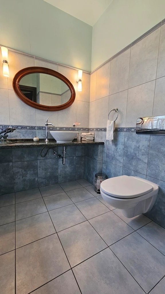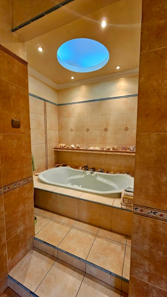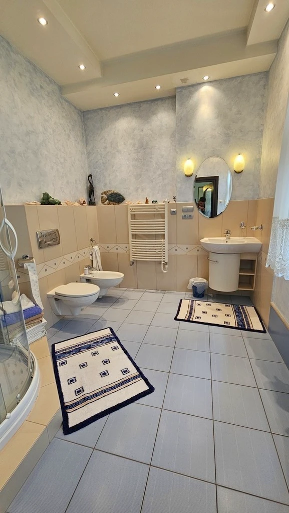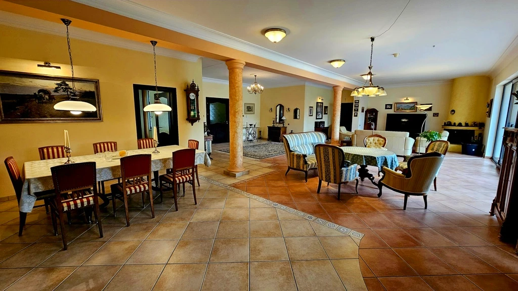 Die durchdachte Raumaufteilung umfasst: - Großer Eingangsbereich - 3 Schlafzimmer - 3 Badezimmer mit Dusche, Badewanne, WC, Bidet, Waschtisch, Fenster und Heizkörper - Separates Gäste-WC - Geräumige, separate Küche mit Vorratskammer - Esszimmer - Hauswirtschafts- und Abstellräume - Waschküche - Wellnesszimmer mit Sauna - Wintergartenähnliches Wohnzimmer (113 m²) mit Kamin und großflächiger Panorama-Schiebetür (HS-System) zum Sonnenterrasse (80 m²) - Doppelter Kamin – innen und außen mit Grillfunktion - Garage für drei Fahrzeuge mit Wartungsgrube