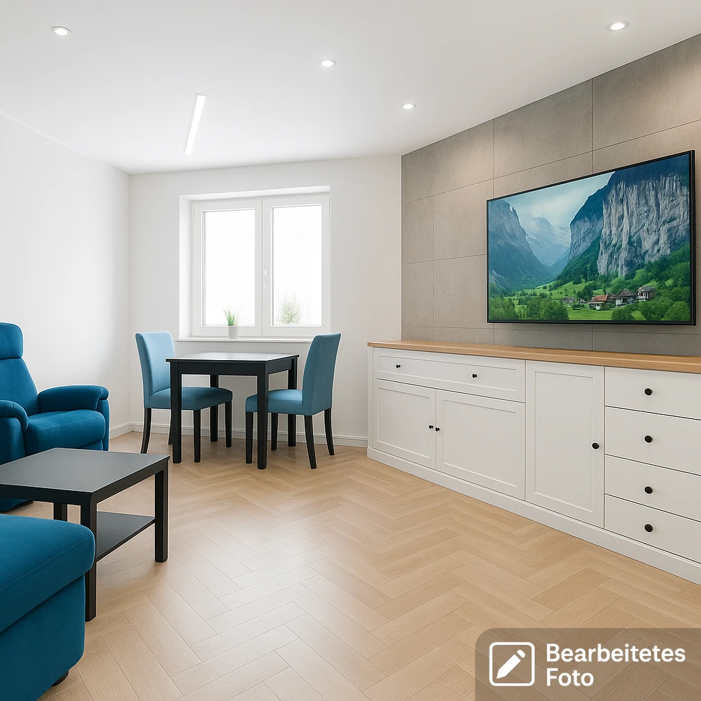- Das erste Foto in unserer Galerie wurde leicht bearbeitet, um zu veranschaulichen, wie die Wohnung aussehen könnte – beispielsweise durch eine geänderte Wandfarbe. Die nachfolgenden Bilder zeigen den tatsächlichen Zustand der Immobilie.