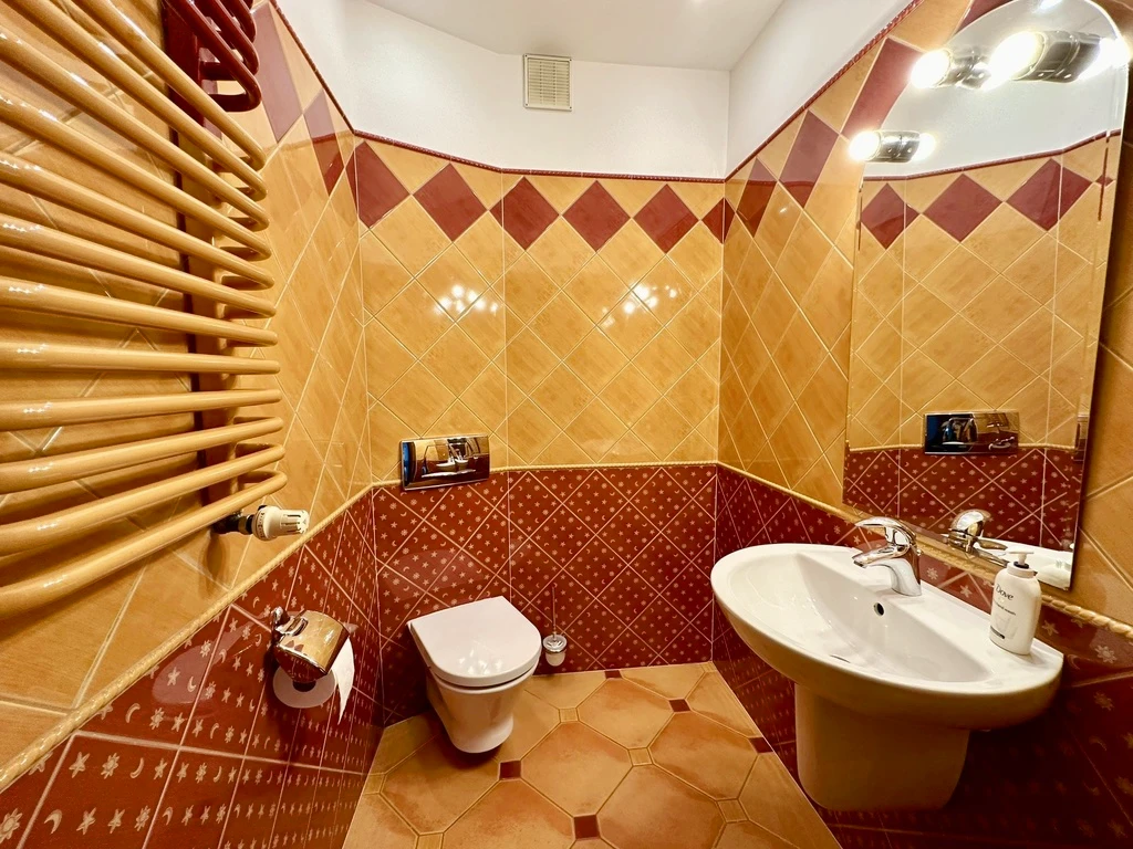 Badezimmerausstattung: Dusche, WC, Waschbecken, Badewanne, Handtuchheizkörper