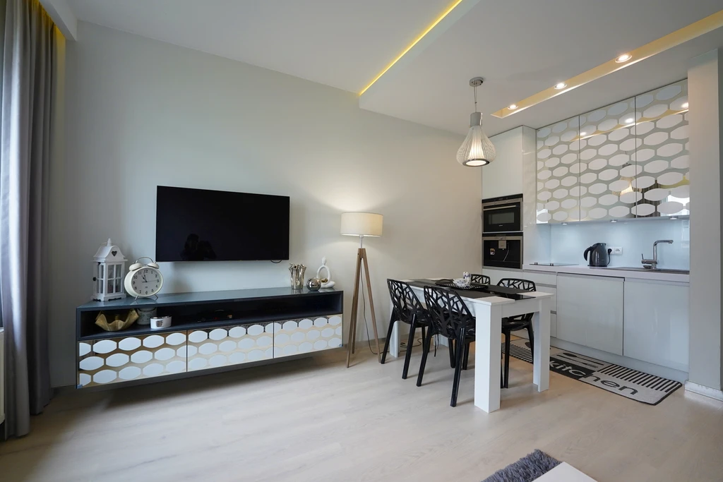 Die Wohnung wurde im modernen Stil eingerichtet und mit hochwertigen Materialien ausgestattet. Die offene Küche verfügt über einen Einbaubackofen sowie eine integrierte Kaffeemaschine der Marke Siemens – beides stilvoll in die Möblierung integriert.