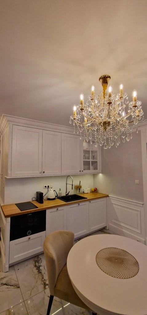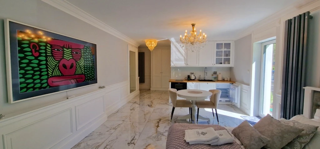 Das maßgefertigte, gepolsterte Kontinentalbett bietet höchsten Schlafkomfort. Italienische Designer-Kronleuchter verleihen den Räumen ein edles Ambiente. Die Küche überzeugt mit maßgefertigten, hochwertigen Möbeln und einer eleganten Holzarbeitsplatte. Geräte der renommierten Marke BOSCH sorgen für moderne Funktionalität.