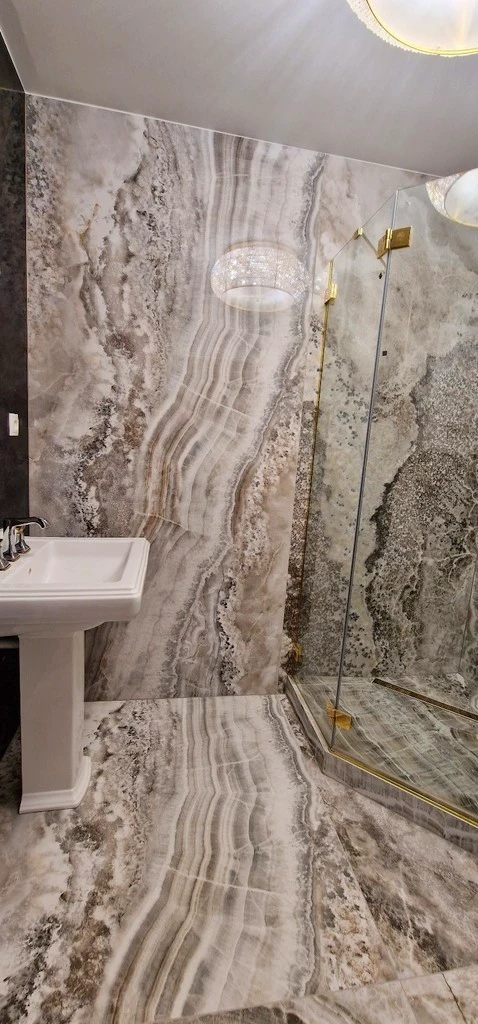 Im stilvollen Badezimmer wurden großformatige Feinsteinzeugfliesen ohne Fugen verwendet, was dem Raum eine klare, elegante Optik verleiht. Sanitärobjekte der Luxusmarke Villeroy & Boch sowie Armaturen von Hansgrohe unterstreichen die exklusive Ausstattung.