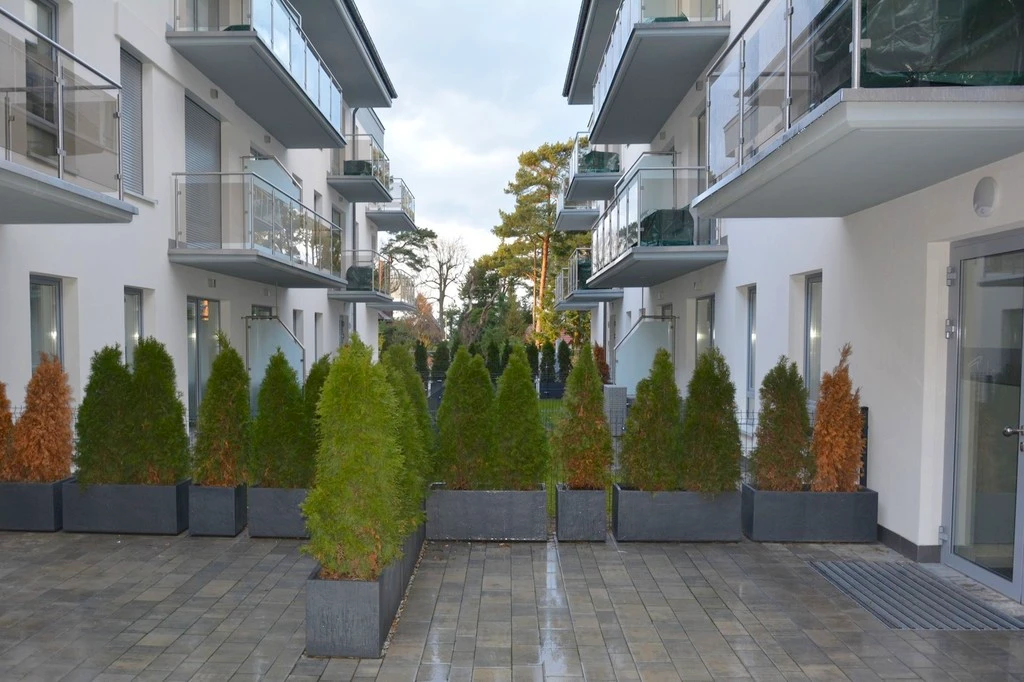 Das Gebäude wurde 2017 erbaut und zeichnet sich durch eine moderne Architektur mit niedriger Wohnbebauung aus. Es liegt direkt neben einem Hotelkomplex mit Swimmingpool, SPA-Bereich und Restaurant. Zur Verfügung der Eigentümer und Gäste steht ein Aufzug im Gebäude, was den Komfort zusätzlich erhöht.