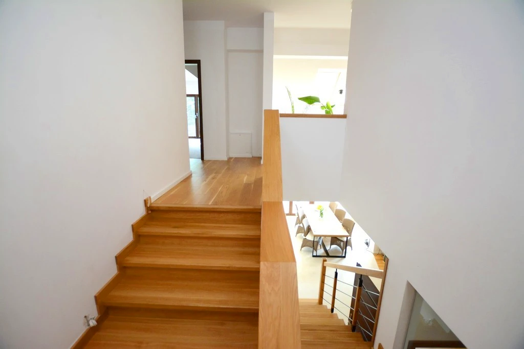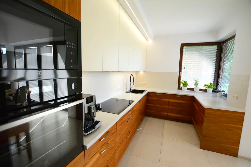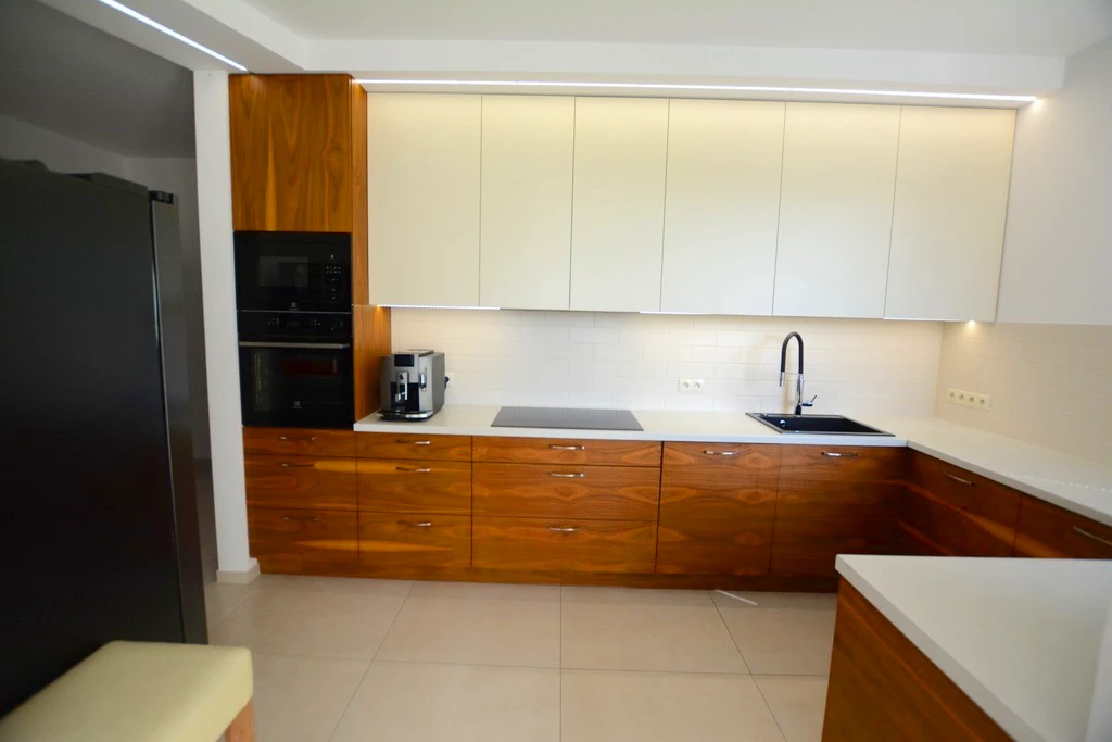 - Individuell gefertigte Einbauküche: inklusive moderner Markengeräte (Dampfbackofen, Induktionskochfeld, Dunstabzug, Geschirrspüler). Premium-Beschläge von Blum, Wasseranschluss für Kühlschrank.