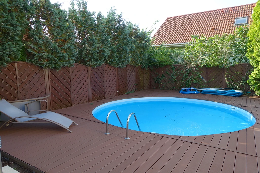 Der wunderschön angelegte Garten bietet viel Raum zur Erholung. Für gesellige Stunden mit Familie oder Freunden stehen eine überdachte Gartenlaube, ein eigener Grillplatz sowie ein runder Pool (5,5 m Durchmesser) mit beheiztem Wasser zur Verfügung. Der gepflasterte Vorplatz sowie das elektrische Einfahrtstor runden das gepflegte Erscheinungsbild ab.