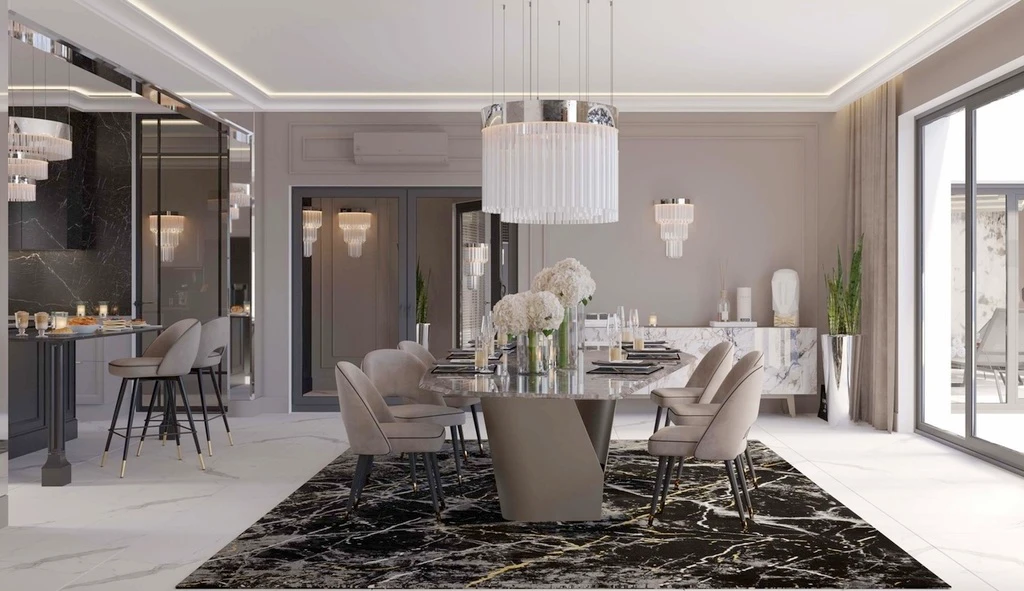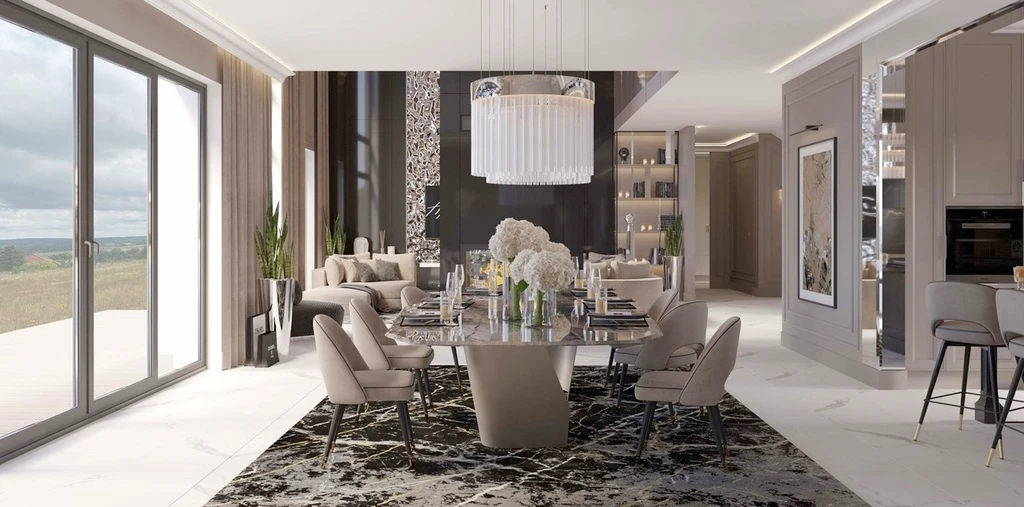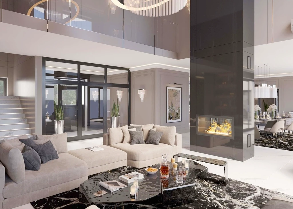 - Großzügiger Wohnbereich mit fast 7,30 m Deckenhöhe, Panoramafenstern und einem zweiseitigen Kamin, der Wohn- und Esszimmer stilvoll miteinander verbindet. Ein offener Grundriss bringt Licht und Weite in den Raum.