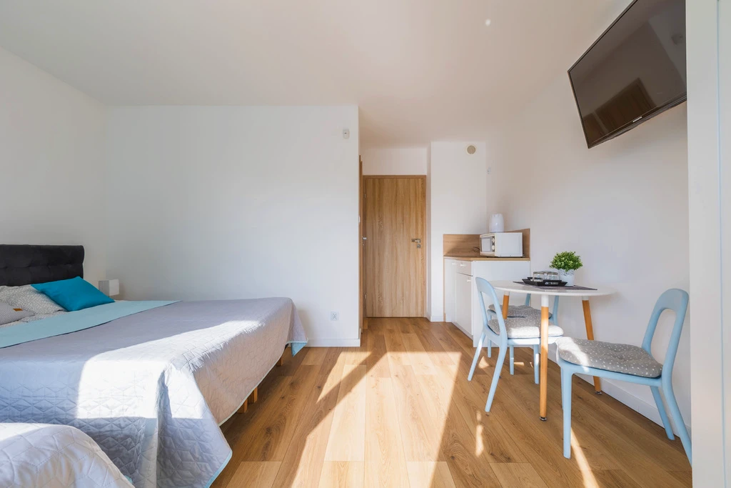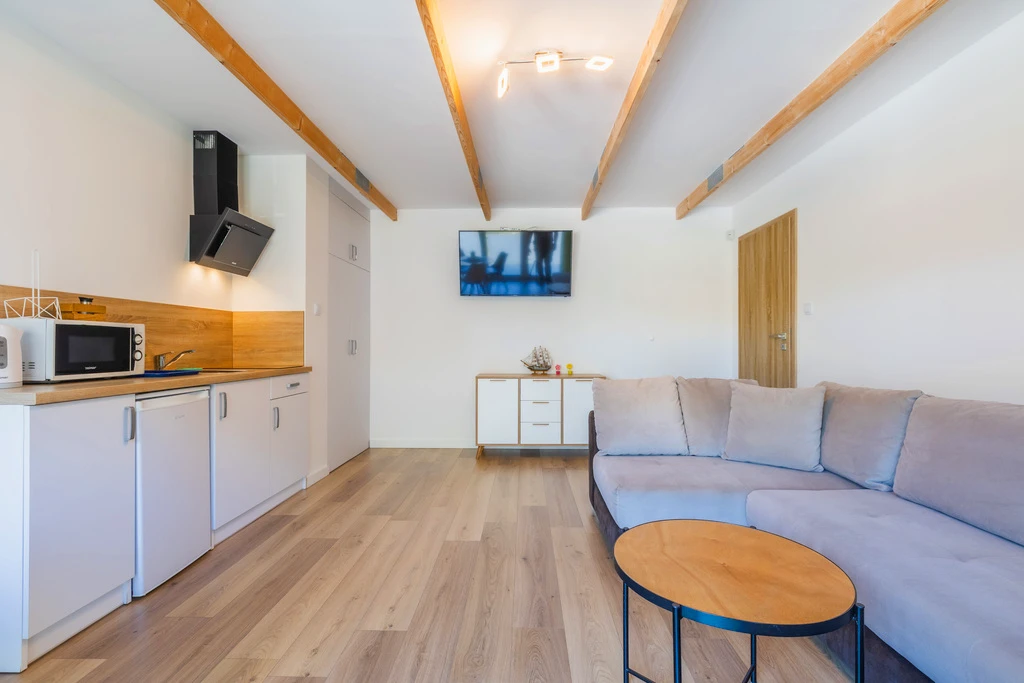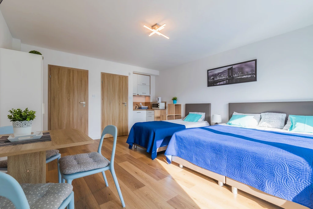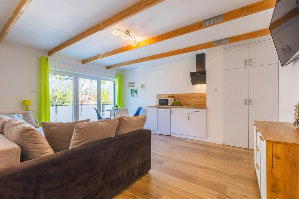 - Zwei großzügige Apartments mit separatem Schlafzimmer, Wohnzimmer mit Küchenzeile und Badezimmer