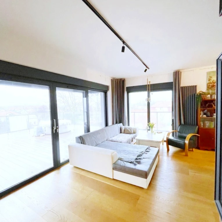- ein stilvoll eingerichtetes Wohnzimmer mit Zugang zur Terrasse,