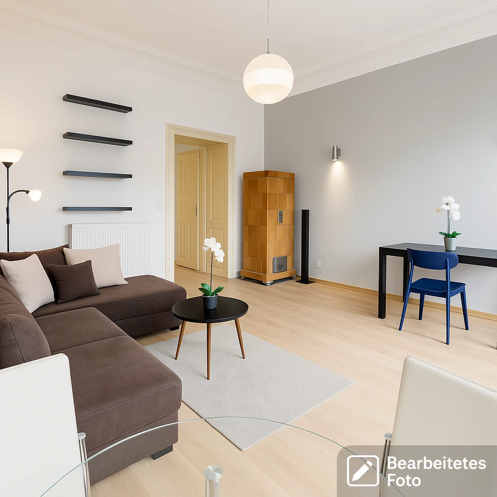 - Das erste Foto in unserer Galerie wurde leicht bearbeitet, um zu veranschaulichen, wie die Wohnung aussehen könnte – beispielsweise durch eine geänderte Wandfarbe. Die nachfolgenden Bilder zeigen den tatsächlichen Zustand der Immobilie.