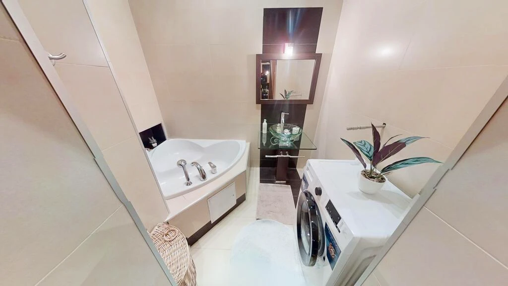 - Badezimmer mit Badewanne, Waschbecken und Waschmaschine