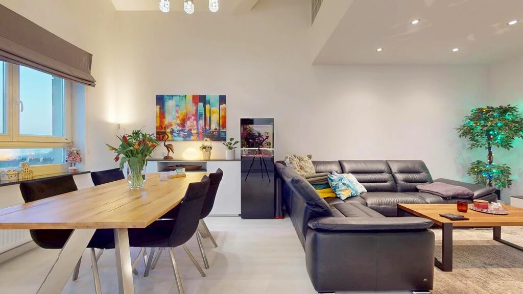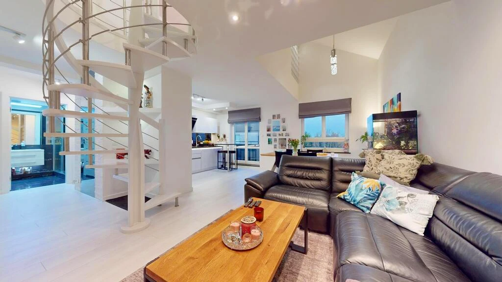 Wir präsentieren Ihnen ein außergewöhnliches, lichtdurchflutetes Maisonette-Apartment mit offener Raumgestaltung und imposanter Deckenhöhe – ein Zuhause mit Charakter und Blick auf den gesamten Stadtraum von Stettin. Vom oberen Stockwerk eröffnet sich in der Ferne sogar ein Panorama auf den Dąbie-See.