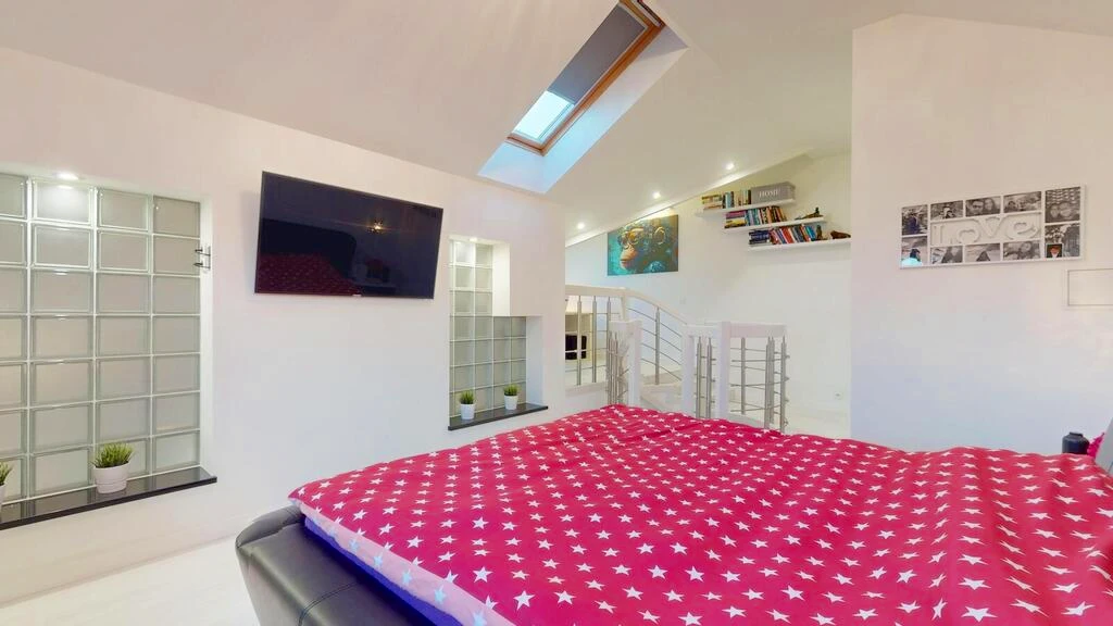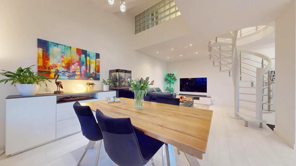 Die Kombination aus 5 Meter hohen Decken, stilvoller Beleuchtung und offener Galerie unterstreicht den loftartigen Stil der Wohnung und sorgt für ein einzigartiges Wohngefühl.