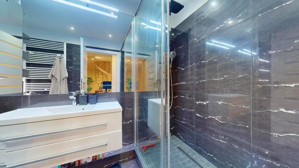 - Badezimmer mit bodengleicher Dusche und Regenduschkopf