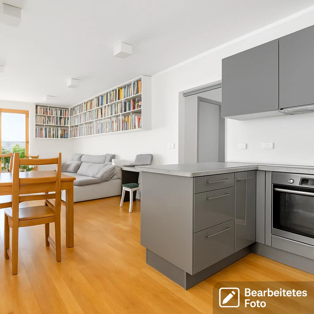 - Wohnzimmer mit offener Küche – ca. 30 m² lichtdurchfluteter Raum mit großen Fenstern und direktem Zugang zum Balkon