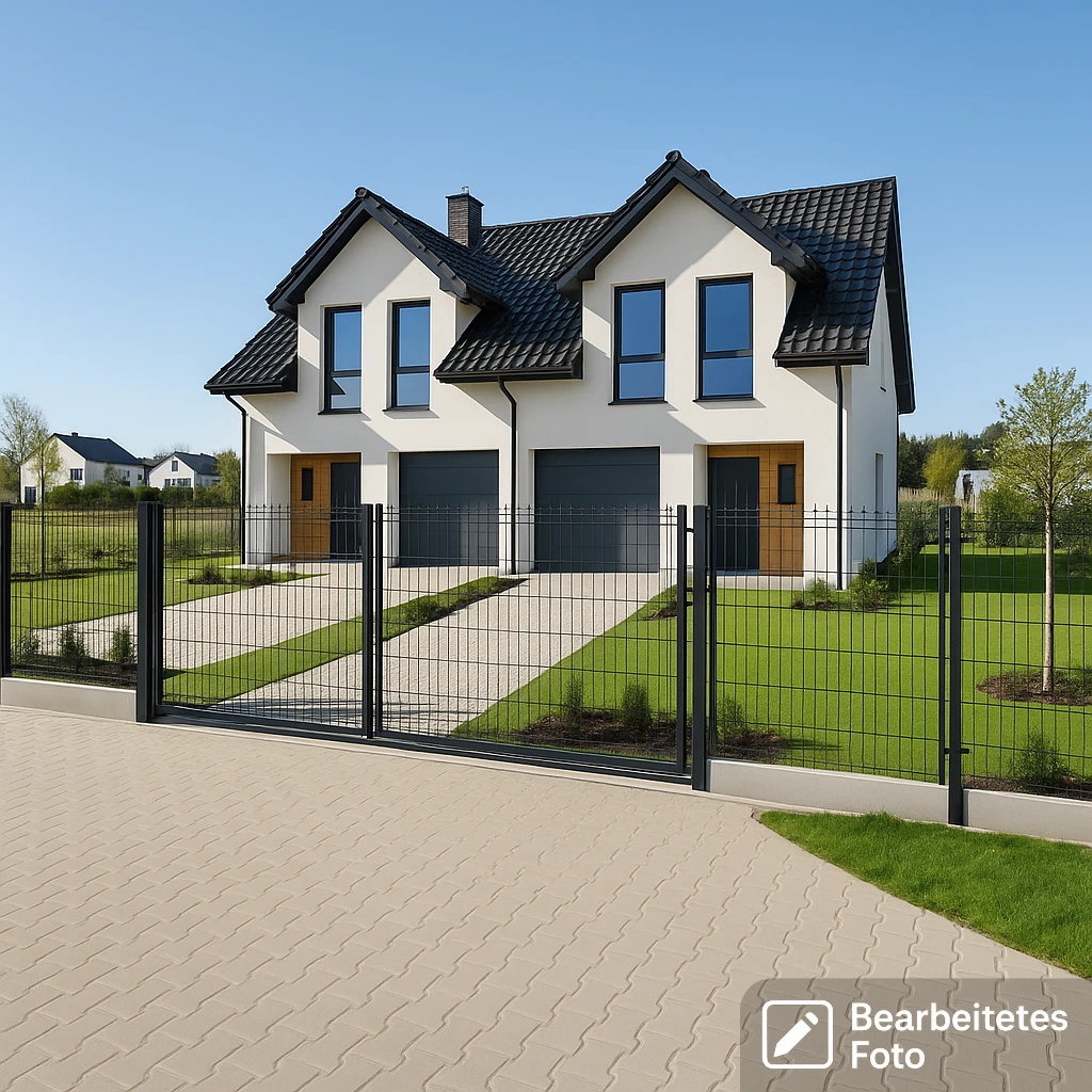 Ihnen steht ein ca. 523 m² großes, vollständig eingezäuntes Grundstück zur Verfügung. Die Einfahrt zum Haus liegt auf der Nordseite, während die Sonnenseite mit dem Garten nach Süden ausgerichtet ist – ideal für sonnige Nachmittage im Freien. Die Zufahrt und der Eingangsbereich wurden bereits mit Betonpflaster befestigt, das Grundstück wurde eingeebnet und ist vollständig erschlossen (Strom, Wasser, Kanalisation, Gas – alles kommunal angebunden).